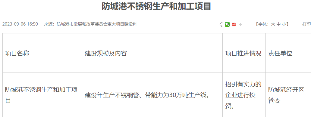 廣西防城港不銹鋼生產和加工項目主要建設年生產不銹鋼管、帶能力為30萬噸生產線,目前項目處于招引有實力的企業進行投資階段。