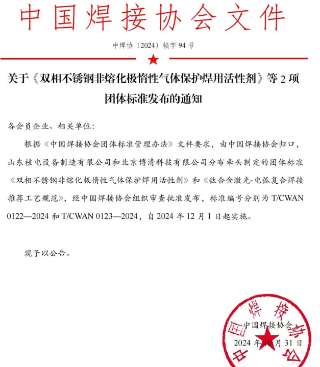 2024年10月31日,據中國焊接協會關于雙相不銹鋼非熔化極惰性氣體保護焊用活性劑》等2項團體標準發布通知稱,由中國焊接協會歸口山東核電設備制造有限公司牽頭制定的團體標準《雙相不銹鋼非熔化極惰性氣體保護焊用活性劑》標準編號為T/CWAN0122-2024,該標準將于2024年12月1日起實施。
