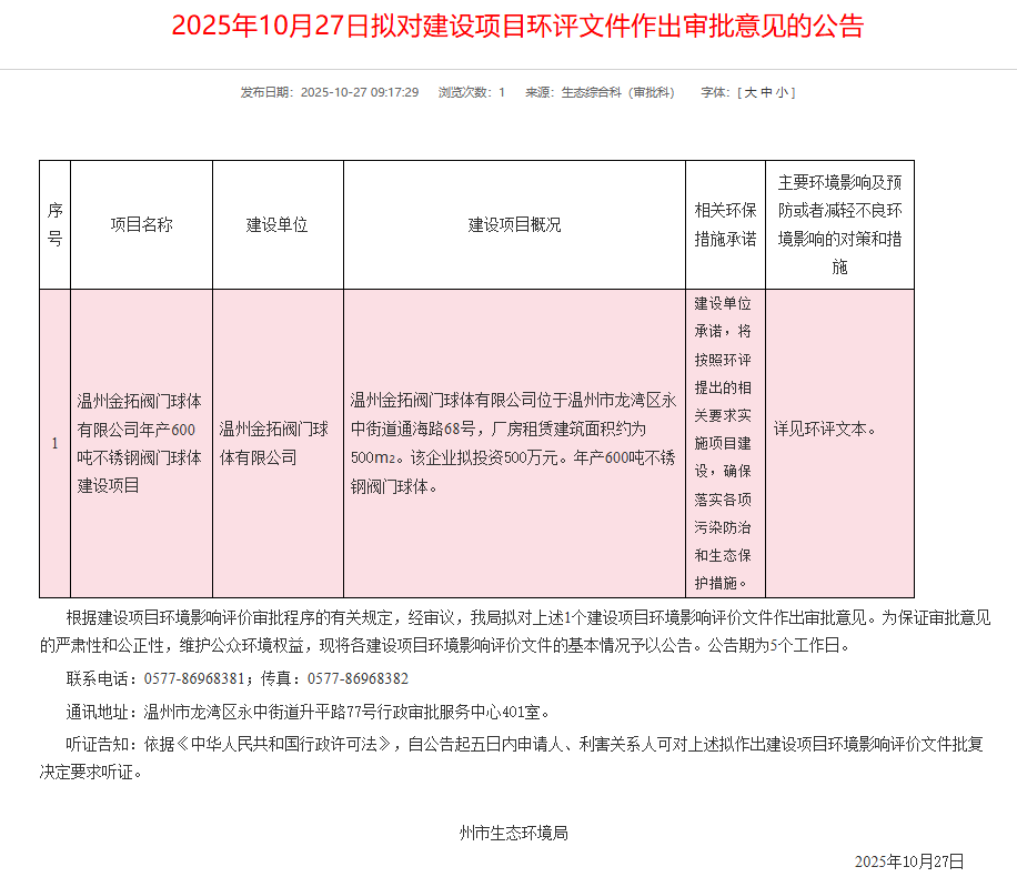 2025年10月27日,溫州市生態環境局就溫州金拓閥門球體有限公司年產600噸不銹鋼閥門球體建設項目環境影響報告表作出審批意見并對外進行公告,公告期:5個工作日。