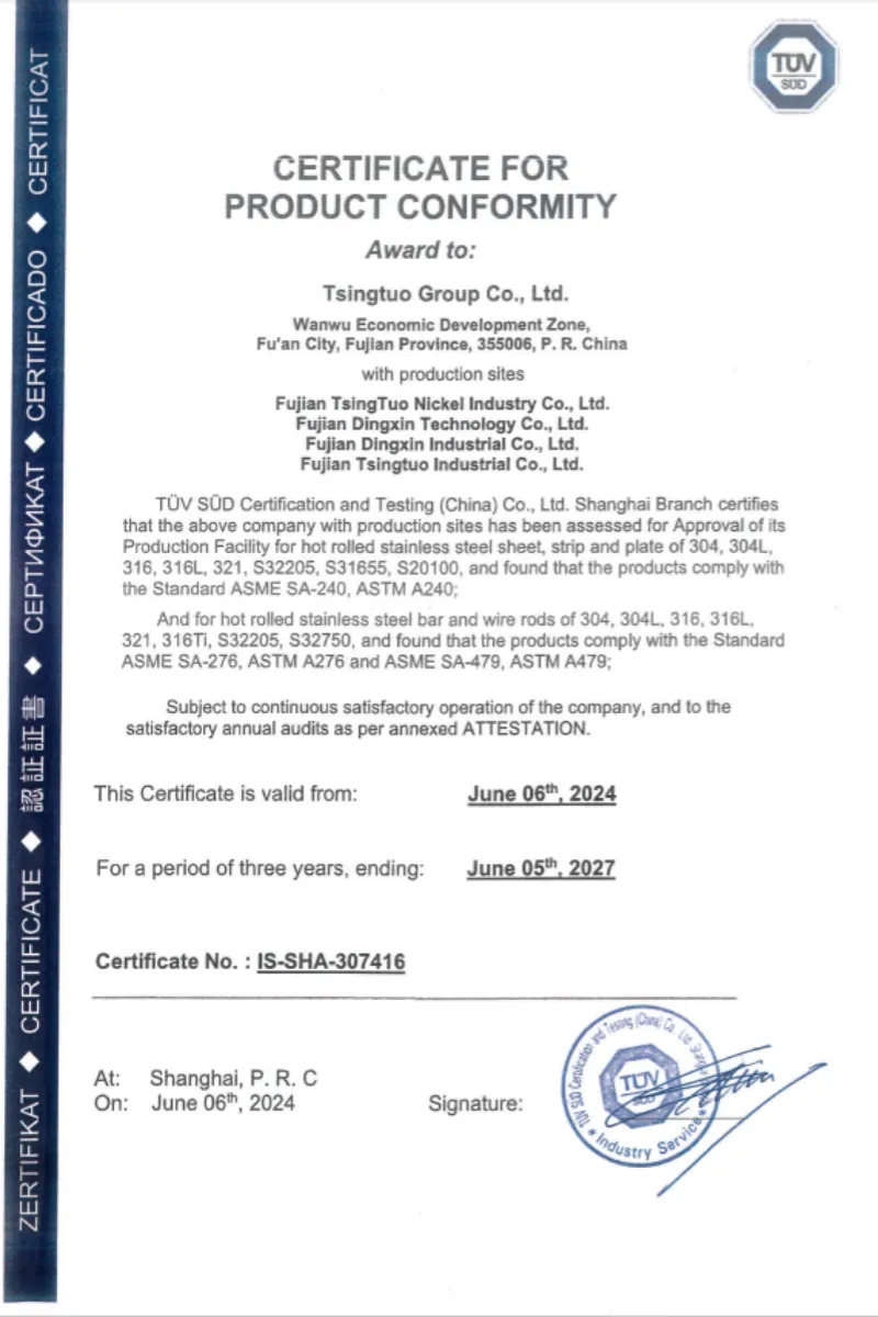 此次認證范圍涵蓋福建青拓鎳業有限公司、福建鼎信科技有限公司、福建鼎信實業有限公司、福建青拓實業股份有限公司,產品包括熱軋不銹鋼卷帶、板材、棒材、盤條(牌號涉及304、304 L、316、316 L、321、316 Ti、S32205、S32750等),經TüV南德取樣測試,認證產品性能符合AS ME SA240/ASTM A240、AS ME SA276/ASTM A276和AS ME SA479/ASTM A479標準要求及產品性能要求。